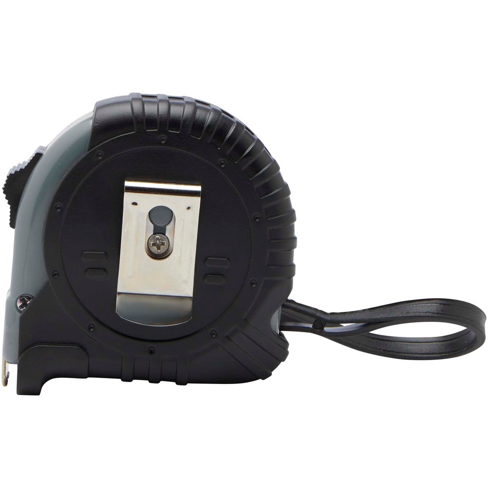 5 meter rolmaat met weergave in centimeters en inches, voorzien van een handige riemclip voor gemakkelijk meenemen.