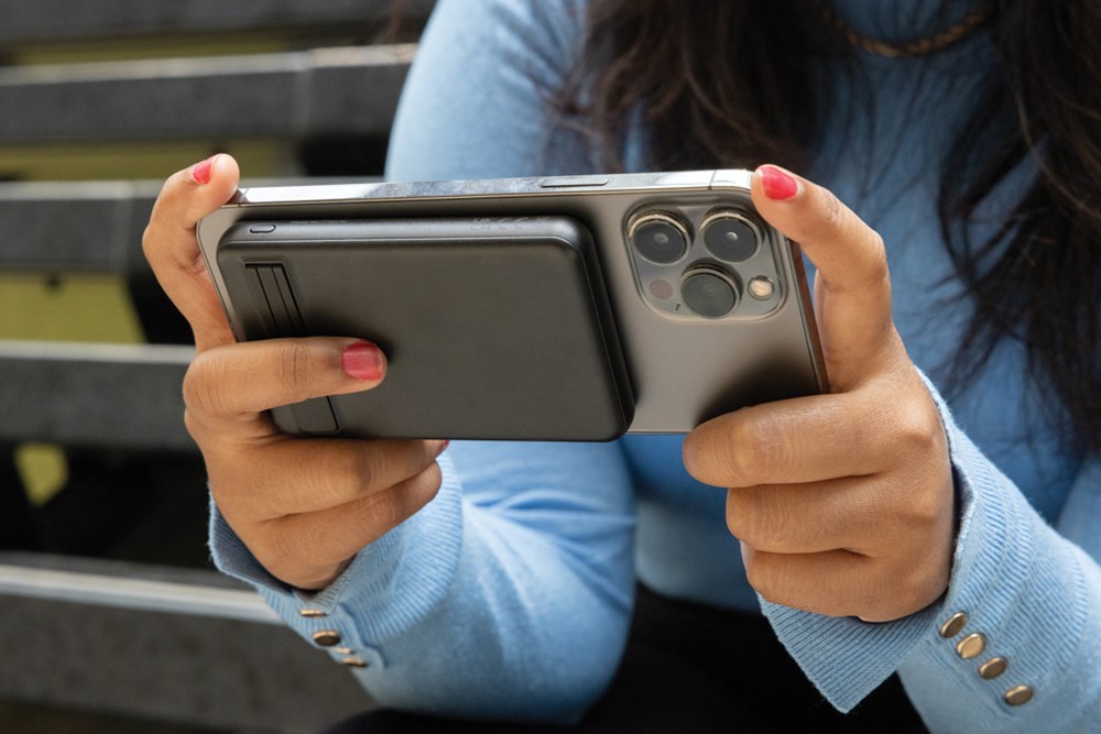 5.000 mAh powerbank van zakformaat met een 5W magnetische draadloze oplader, met een behuizing gemaakt van RCS-gecertificeerd gerecycled ABS-plastic en FSC-gecertificeerd bamboe. RCS (Recycled Claim Standard) is een norm om het gerecyclede gehalte van een product door de hele toeleveringsketen te verifiëren. Totaal gerecycled gehalte: 22% op basis van het totale productgewicht. De powerbank bevat een duurzame grade A 5.000 mAh lithium-polymeerbatterij. Met geïntegreerde telefoonstandaard. De stroomindicatoren geven het resterende energieniveau aan, zodat je altijd weet wanneer je moet opladen. Type-C Input: 5V/2.4A; Type C output: 5V/2A. Het artikel en de accessoires zijn PVC-vrij. Inclusief RCS-gecertificeerde gerecyclede TPE-oplaadkabel. Verpakt in FSC® mix verpakking.
