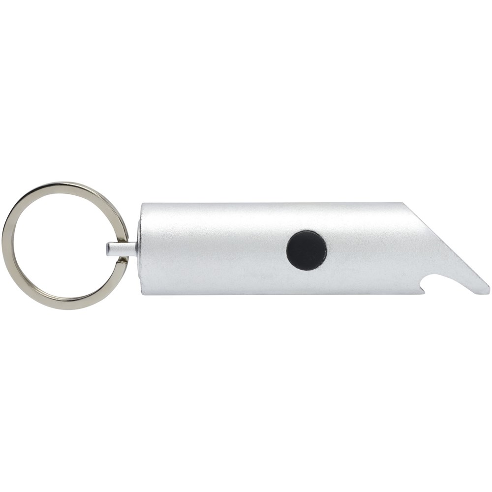 Helder led-sleutellampje met flesopener, aan/uit-knop en een gespleten ijzeren sleutelhanger. Het is gemaakt van lichtgewicht en sterk 63% RCS-gecertificeerd gerecycled aluminium. De Recycled Claim Standard (RCS) controleert de gerecyclede inhoud van een product in de hele toeleveringsketen. Verkrijgbaar in verschillende opvallende kleuren met een metallic afwerking, waardoor een gedrukt logo mooi opvalt. Wordt geleverd met drie LR44-batterijen.