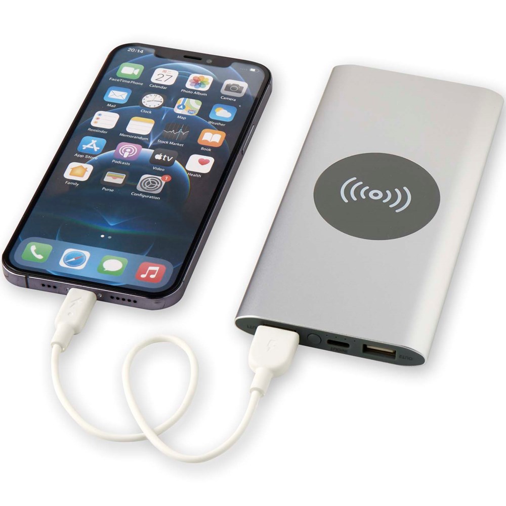 Powerbank met Type-C in/uitgangspoort en 2 x USB-A-poorten, wat betekent dat drie apparaten tegelijk kunnen worden opgeladen. Het ondersteunt ook 5 W draadloos opladen voor alle apparaten met Qi. De powerbank heeft een 8000 mAh lithium-polymeerbatterij die een totaal uitgangsvermogen levert van max. 10 W. Deze powerbank is gemaakt van 28% RCS gecertificeerd gerecycled plastic. Geleverd met een TPE Type-C naar USB-A-oplaadkabel.
