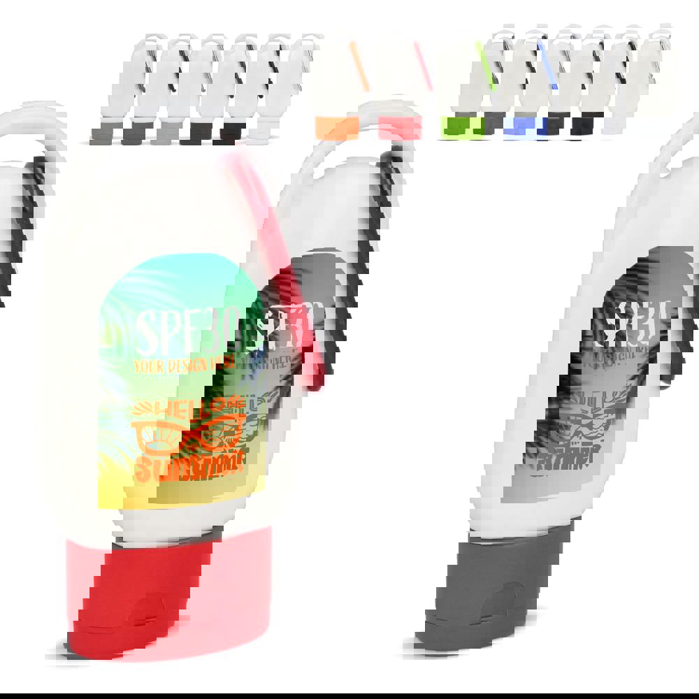 Handige SPF30 zonnebrandcrème in een compacte verpakking met karabijnhaak. Gemaakt van gerecycled kunststof. Eenvoudig aan een tas te bevestigen – ideaal voor festivals, buitenactiviteiten of onderweg.