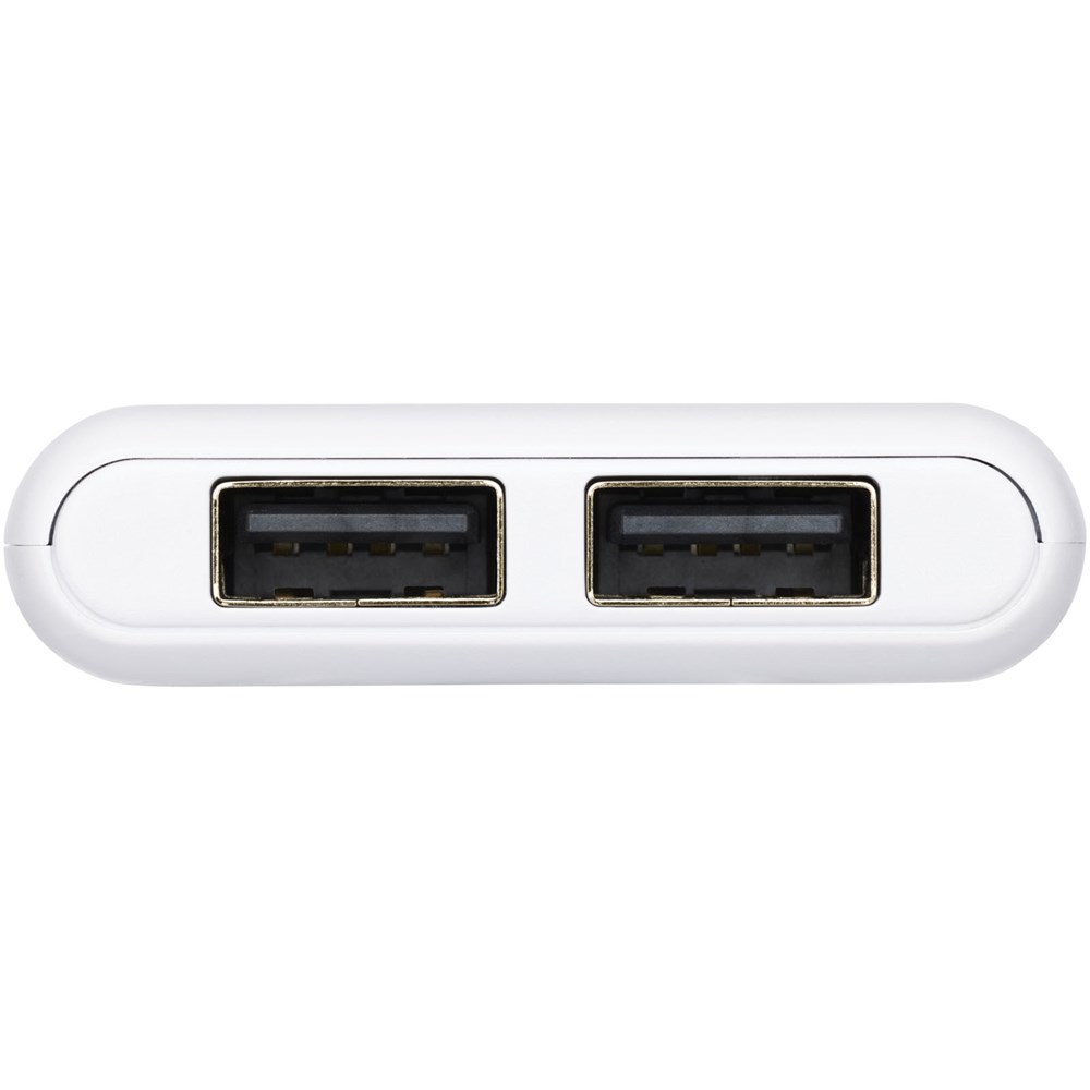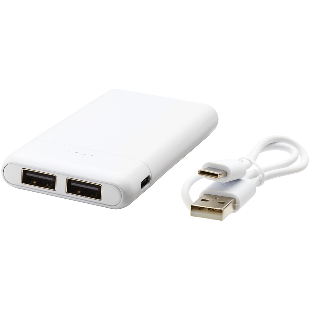 Powerbank in zakformaat met een 5000 mAh high density-batterij. Type-C-ingang (5 V/2 A) en dubbele USB-A-uitgang (5 V/2 A). Inclusief PVC-vrije TPE kunststof oplaadkabel. Geleverd in een Avenue-geschenkverpakking.