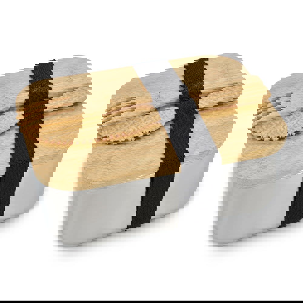 RVS lunchbox met bamboe deksel. Afgesloten met een elastische band waarin je ook de bamboo mes en vork bevestigd. Individueel verpakt in een geschenkdoos.